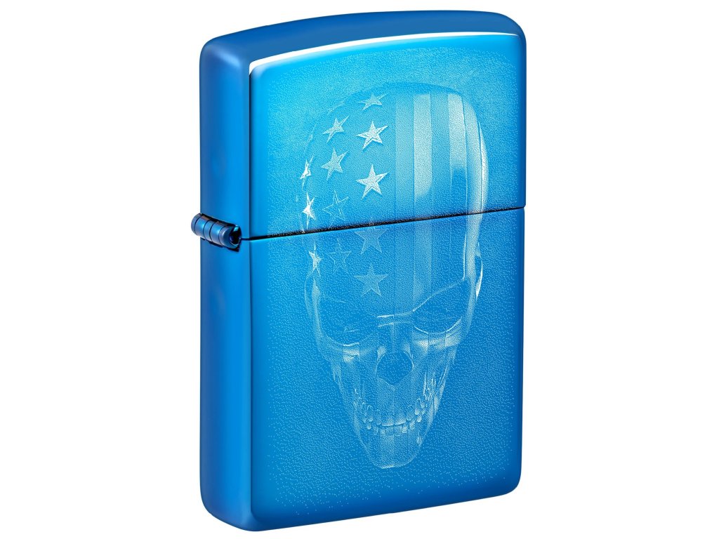 Zippo zapalovač v High Polish Blue s robotickou lebkou ozdobenou americkou vlajkou. Zapalovač obdržíte v originální dárkové krabičce Zippo.