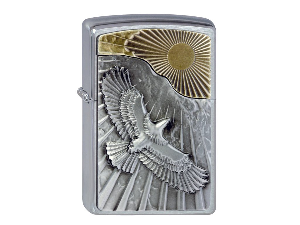 Americký orel letí vstříc zářícímu slunci na netradičním emblému tohoto Zippo zapalovače. Větruodolný benzínový zapalovač s doživotní zárukou.