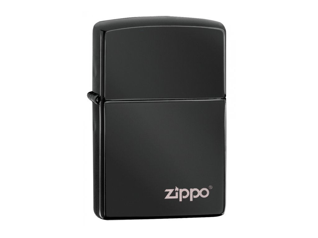 Originální benzínový zapalovač Zippo s lesklým černým povrchem Ebony a s logem značky ve spodním rohu. Zapalovač je dodáván v dárkové krabičce.
