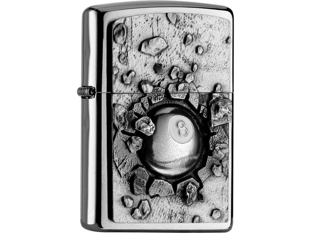 Zippo zapalovač s masivním emblémem na přední straně (motiv kulečníkové koule). Originální Zippo s doživotní zárukou.