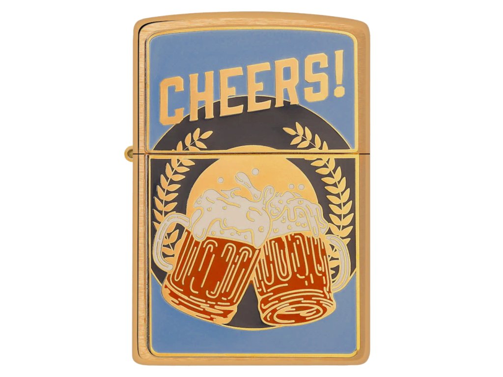 Dopřejte si stylové připálení s klasickým Zippo zapalovačem ve variantě Brushed Brass (kartáčovaná mosaz). Na čelní straně najdete kovový emblém s nápisem „Cheers!“ a dvěma cinkajícími půllitry piva – ideální motiv pro každého pivaře a pohodáře.