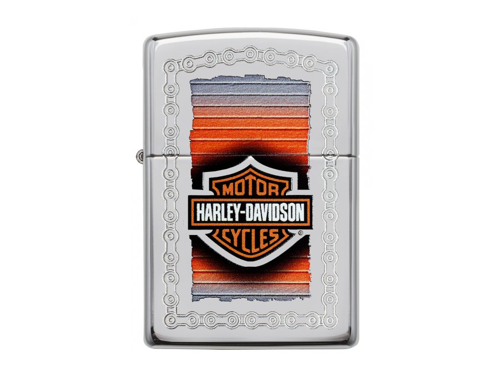 Benzínový Zippo zapalovač zdobený logem Harley-Davidson a rytinou řetězu kolem obvodu. Originál Zippo s doživotní zárukou.