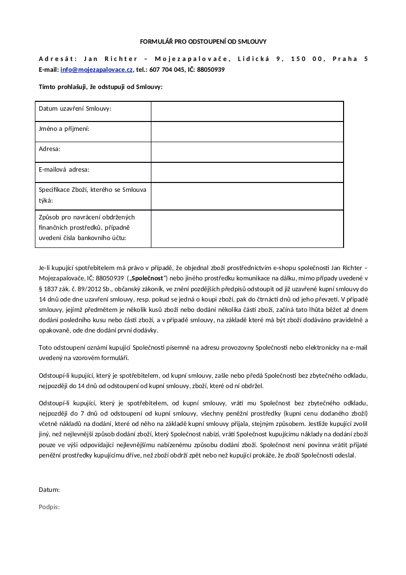Vzor/on-line formulář pro odstoupení od smlouvy je dostupný zde.Kupující však nemůže odstoupit podle výše uvedeného od kupní smlouvy:
