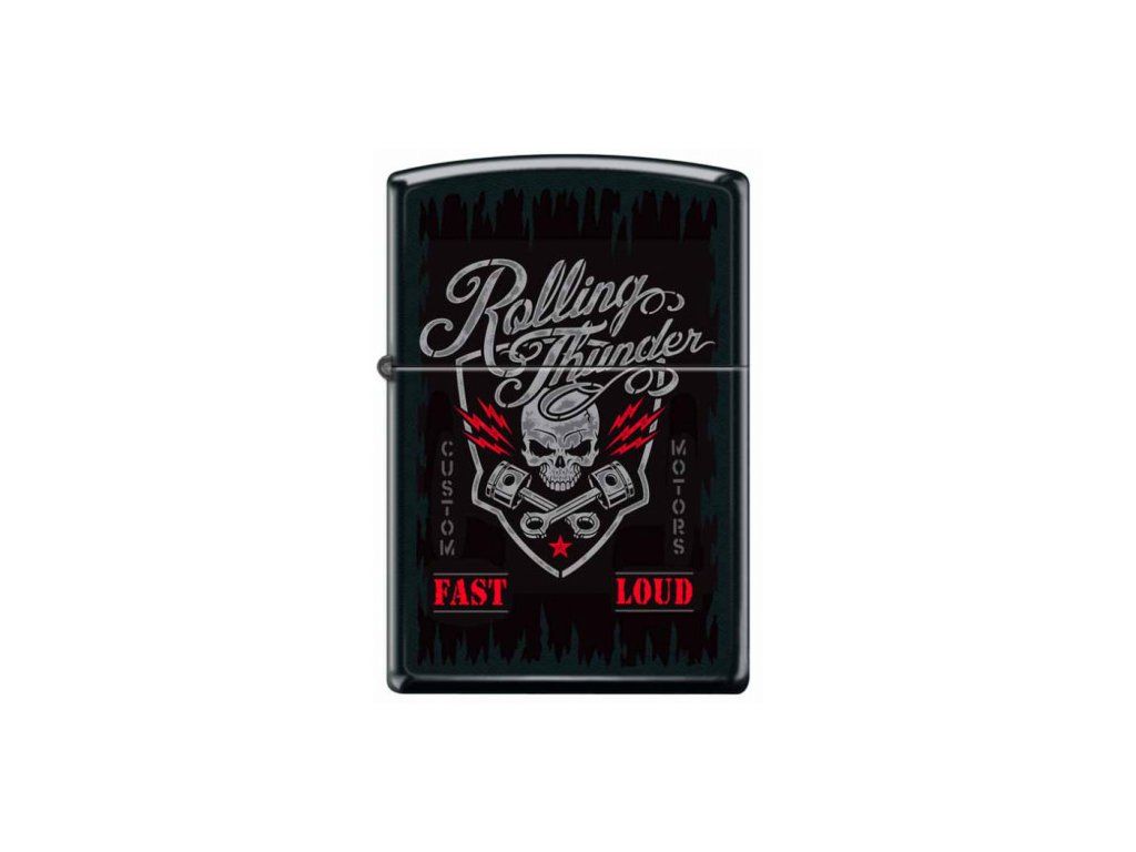 Zapalniczka Zippo Rolling Thunder 26980 to oryginalny produkt amerykańskiej marki, będący częścią kolekcji Auto-Moto. Bazę tego modelu stanowi obudowa Black Matte, wykończona trwałą, czarną powłoką proszkową o matowej strukturze. Powierzchnia ta jest odporna na zarysowania i powstawanie odcisków palców, co zapewnia estetyczny wygląd przy codziennym użytkowaniu. Na przedniej stronie zapalniczki znajduje się precyzyjny kolorowy nadruk z motywem Rolling Thunder.