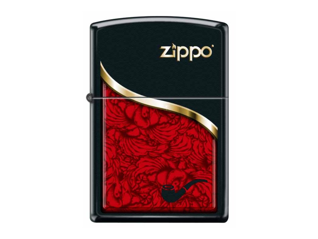 Elegantní dýmkový zapalovač Zippo s logem značky na víčku a s piktogramem dýmky ve spodním rohu. Zapalovač s doživotní zárukou.