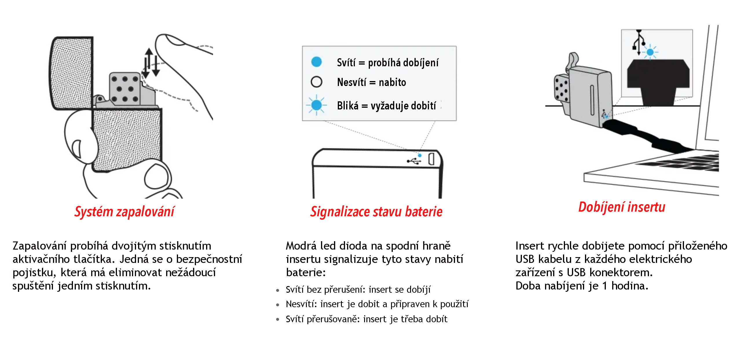 Pokud preferujete moderní technologie, ale i značka Zippo je Vašemu srdci blízká, tak nové USB originální inserty Zippo jsou ideálním řešením. Není třeba řešit vůni benzínu, kterou někteří milují, jiní nesnesou. Plazmové oblouky jsou též větruodolné a k dispozici na stisknutí tlačítka. Insert pohodlně nabijete každým zařízením s USB výstupem.