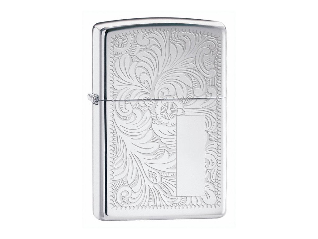 Pochromovaná verze Zippo Venetian (zapalovač zdobený květinovým benátským vzorem). Velmi populární řada benzínových Zippo zapalovačů.